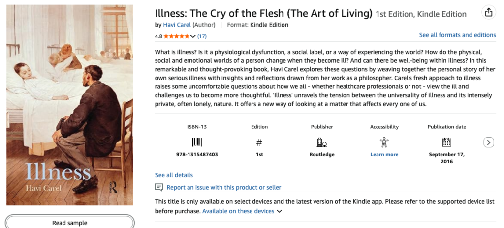 Oh before I forget, I want to get this on Kindle – it’s like $57, but if I were to get the paperback it would be over $300. It is a philosopher’s philosophical account of chronic illness, and I feel important to the understanding of creating graphic medicine.